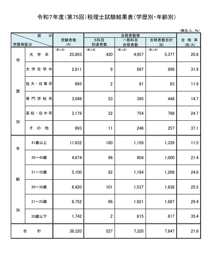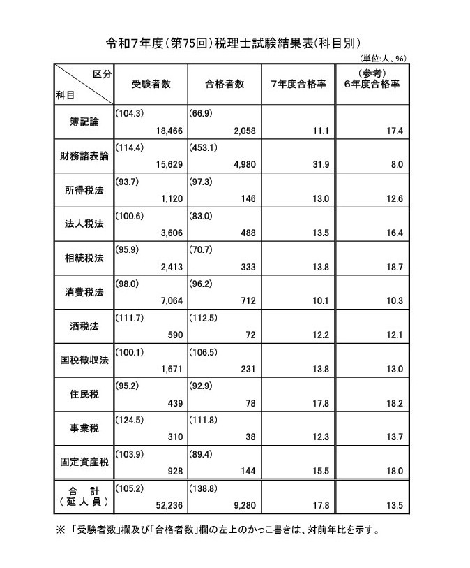 最初は科目別の合格状況です(出典:令和7年度(第75回)税理士試験結果表<次の表も同じ>)。